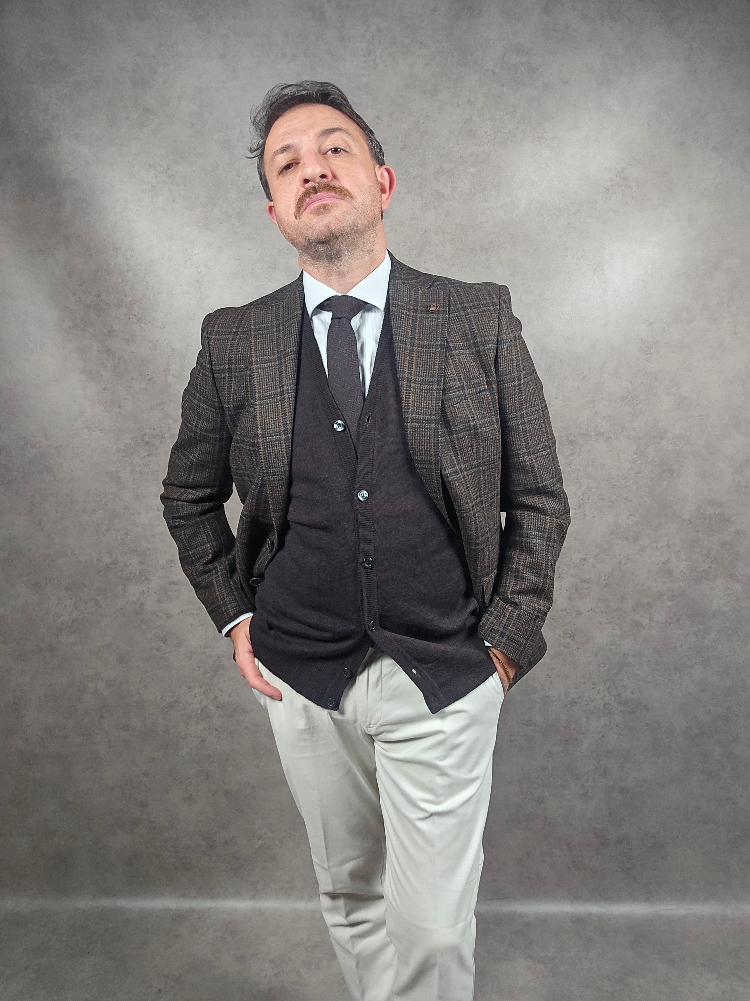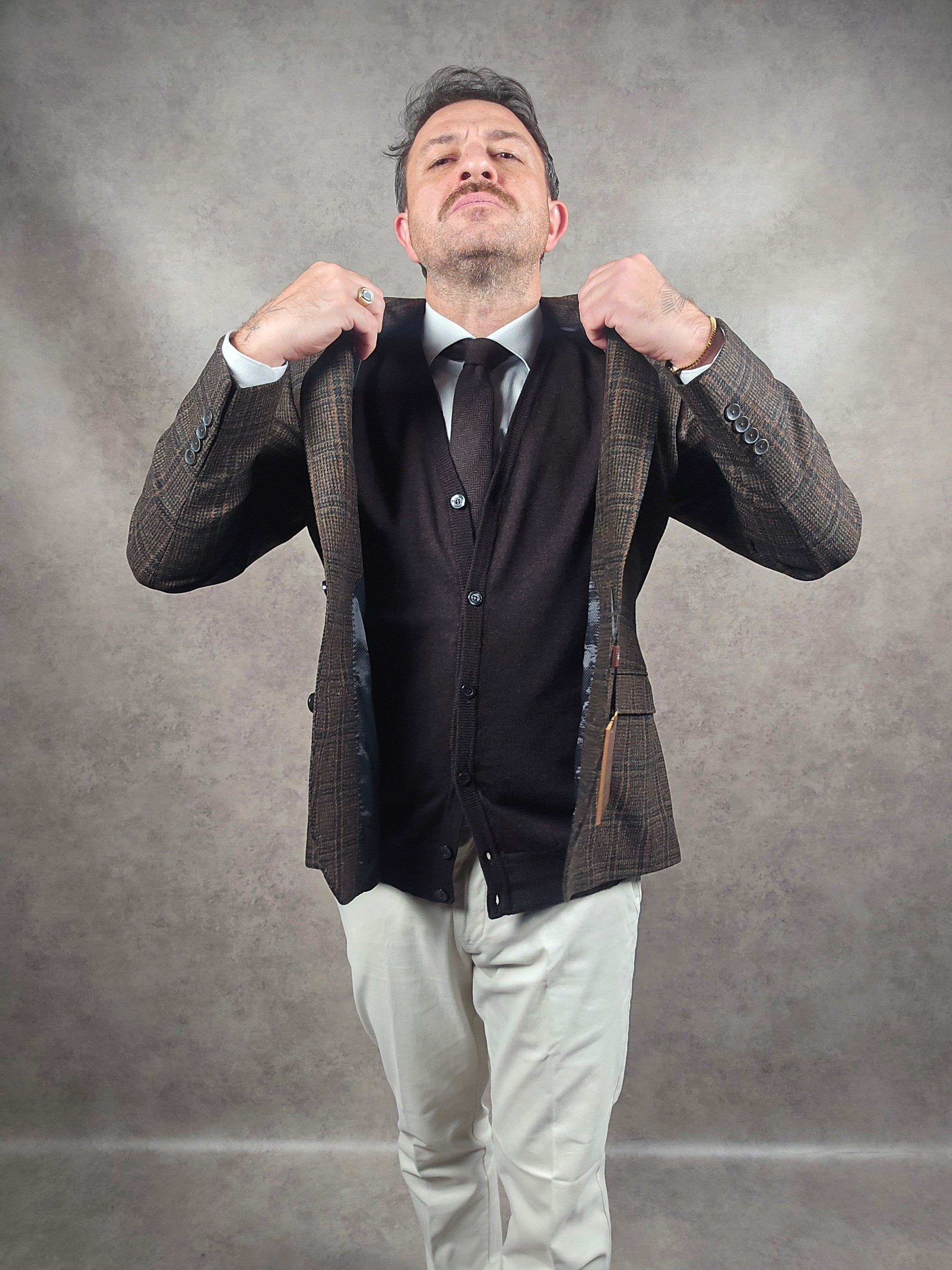 Two large inside pockets, one with button closure. Also two smaller pockets inside left side.