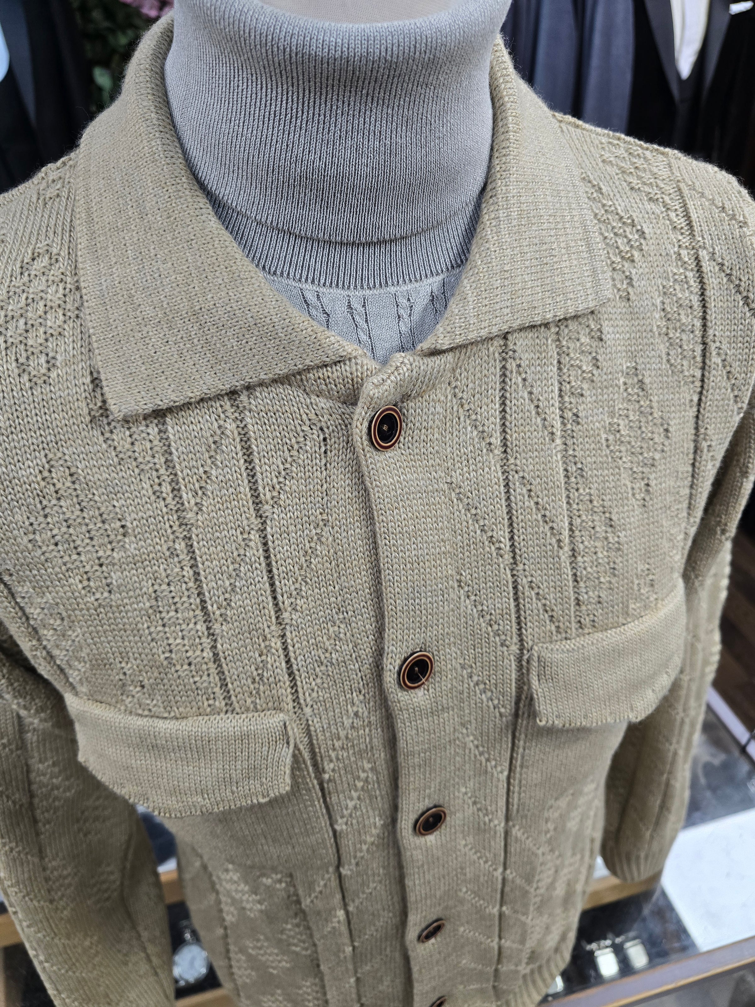Collared full button beige cardy with knit weave detail. Cool as a layer piece, cooler with a tee and some jeans