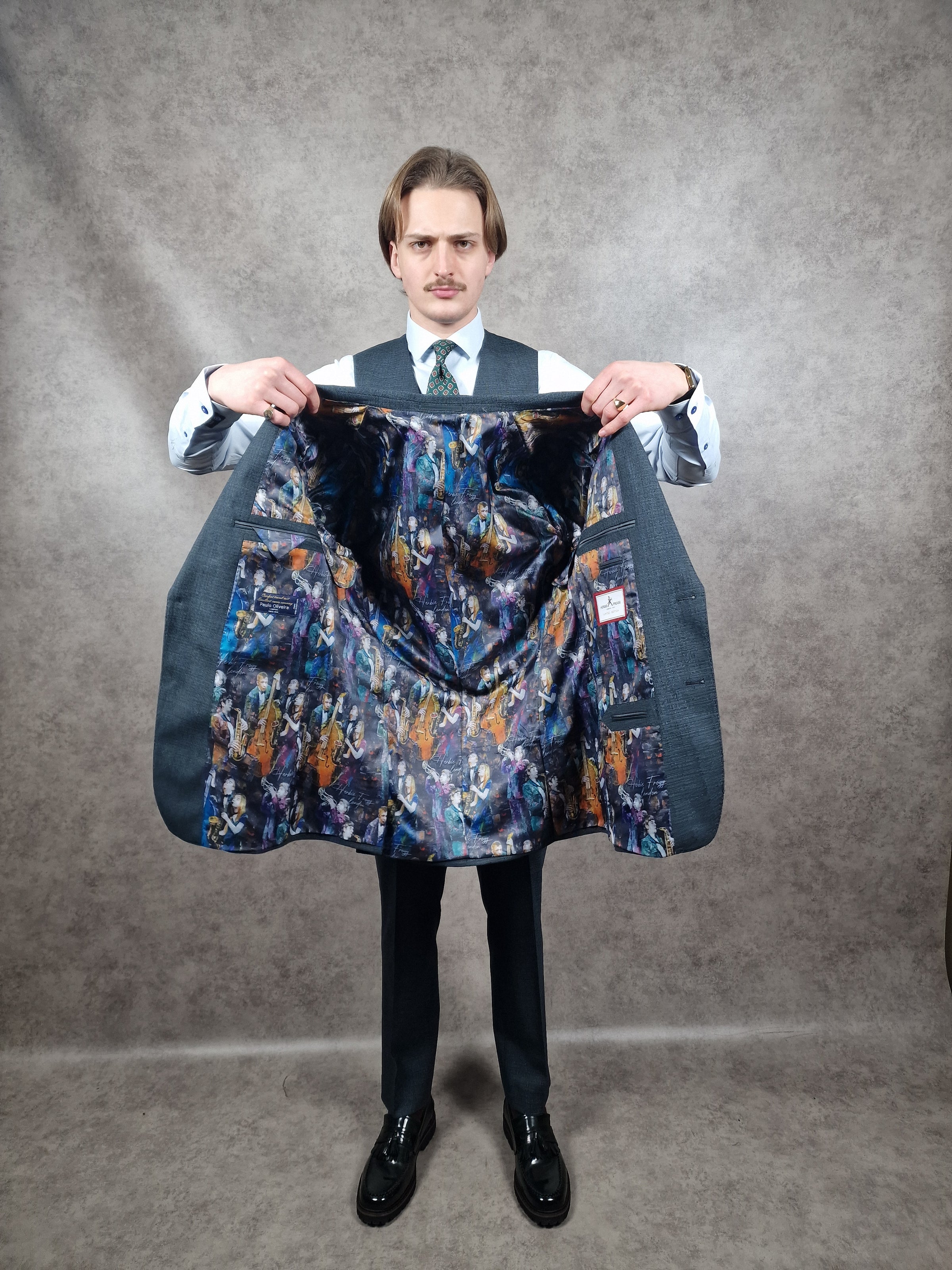 Dark green with highlights of fleck through out, definitely a step up and a move in the right direction for a new suit especially if you are a African sunset red head