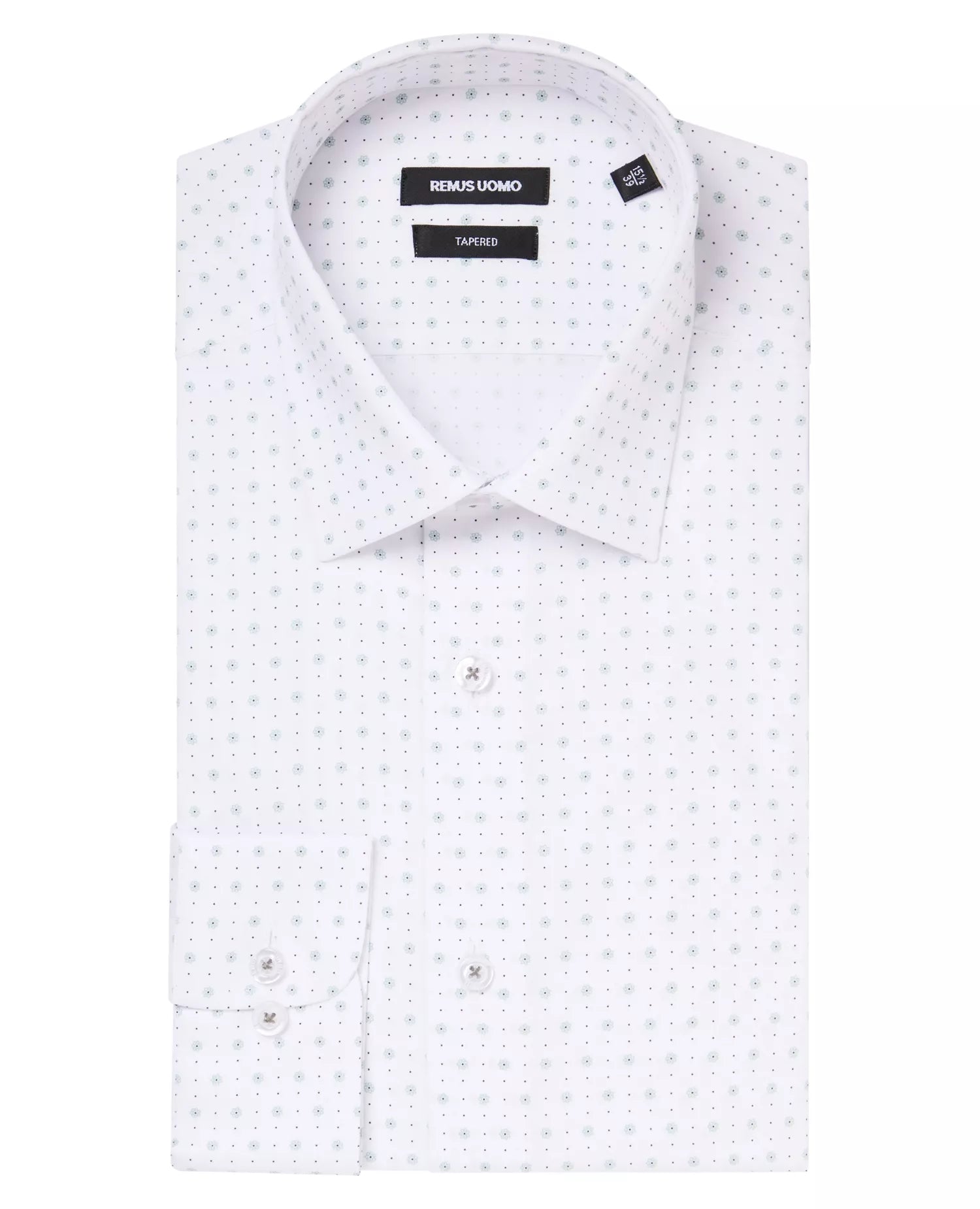Taper fit, cutaway collar. Small blue micro floral print. Works best with navy both blazers and jeans