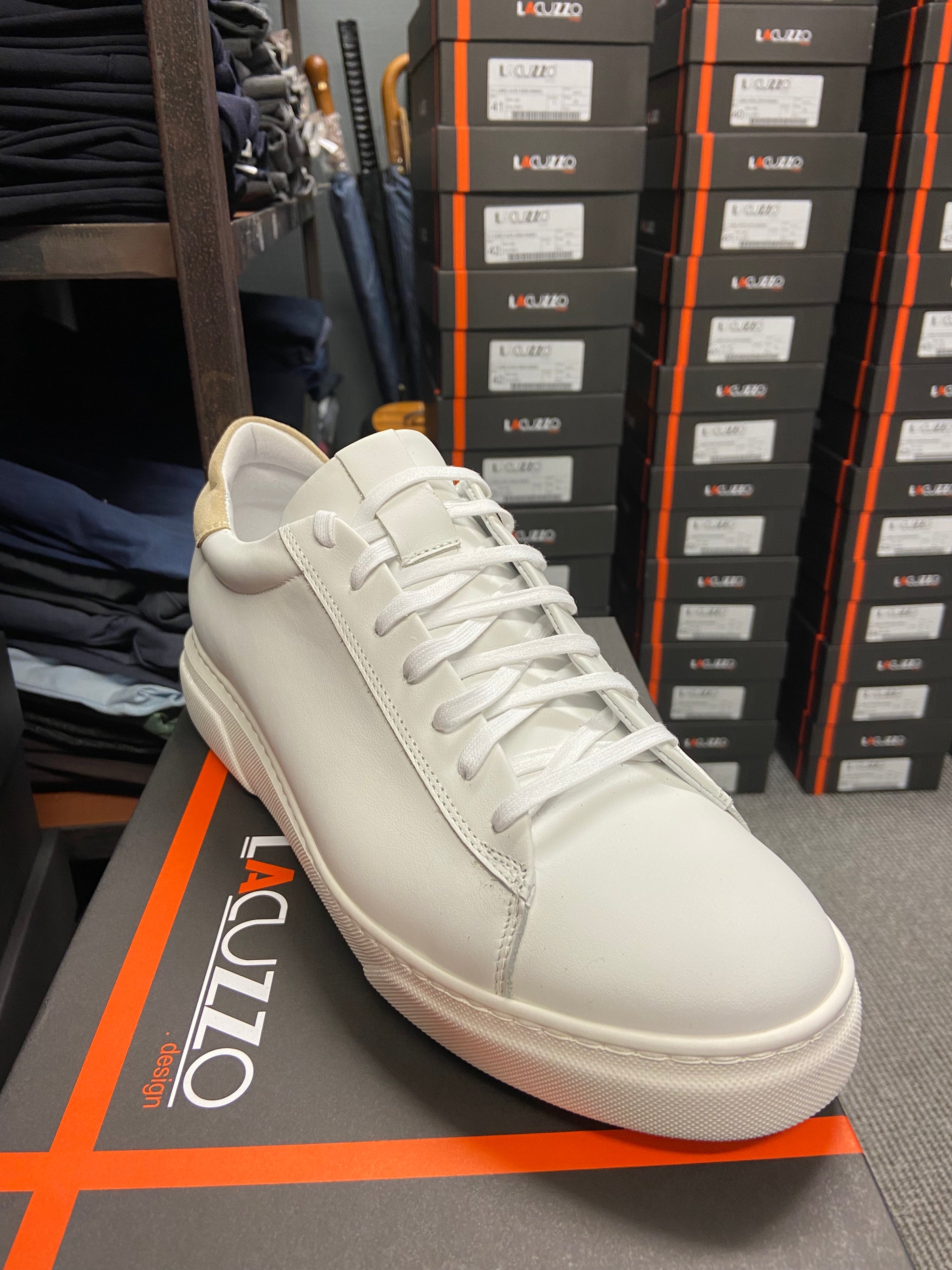 Vale style leather sneaker white coloured with taupe nubuck heel